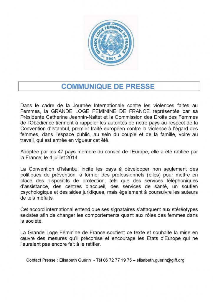 Dans le cadre de la Journée Internationale contre les violences faites au Femmes, la GRANDE LOGE FEMININE DE FRANCE représentée par sa Présidente Catherine Jeannin-Naltet et la Commission des Droits des Femmes de l’Obédience tiennent à rappeler les autorités de notre pays au respect de la Convention d’Istanbul, premier traité européen contre la violence à l’égard des femmes, dans l’espace public, au sein du couple et de la famille, voire au travail, qui est entrée en vigueur cet été.