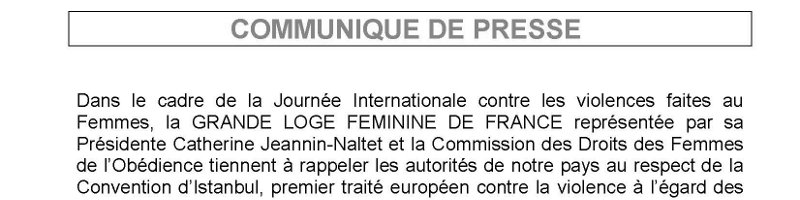 COMMUNIQUE DE PRESSE DE LA GRANDE LOGE FEMININE DE FRANCE (GLFF) SUR LA JOURNEE INTERNATIONALE DES VIOLENCES FAITES AUX FEMMES