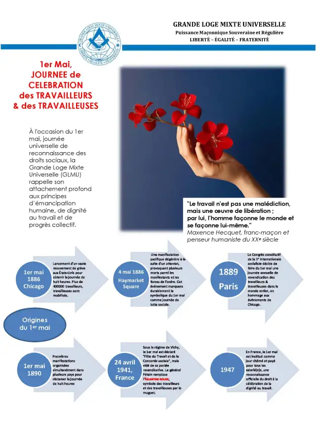Communiqué de la Grande Loge Mixte Universelle (GLMU) sur le premier Mai, journée de célébration des Travailleurs et des Travailleuses.