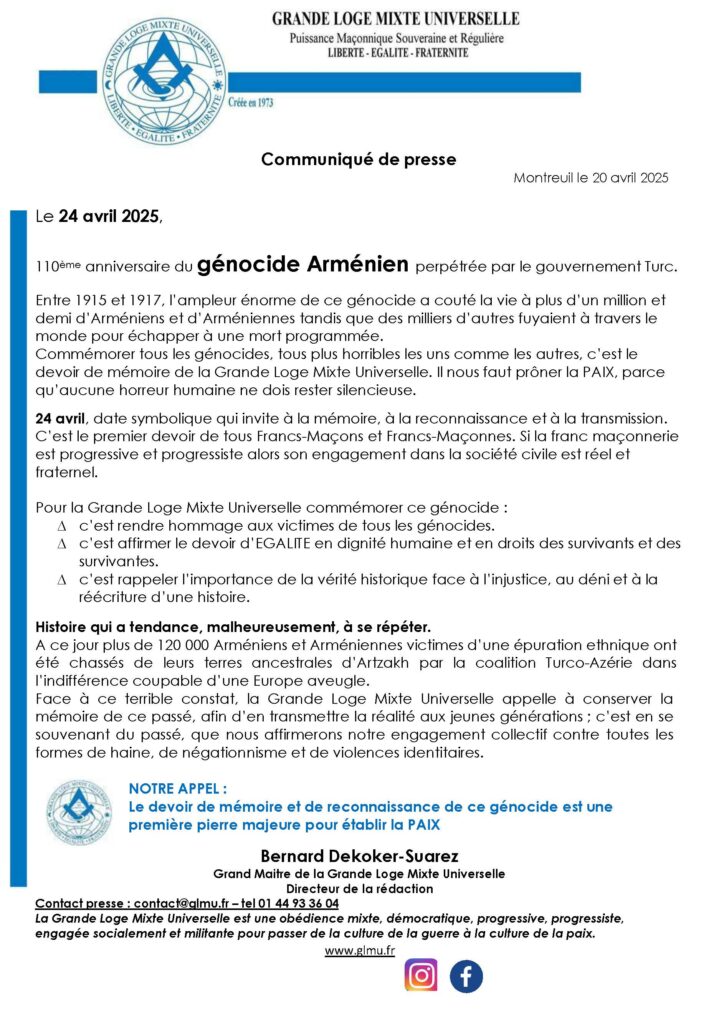 Bonjour. L’occasion surtout de relever le génocide ouvertement reconnu de tous et notamment de ceux qui l’engendrent actuellement. La franc-maçonnerie humaniste ne doit pas attendre 110 ans pour le reconnaître et agir par le verbe à l’extérieur des temples.