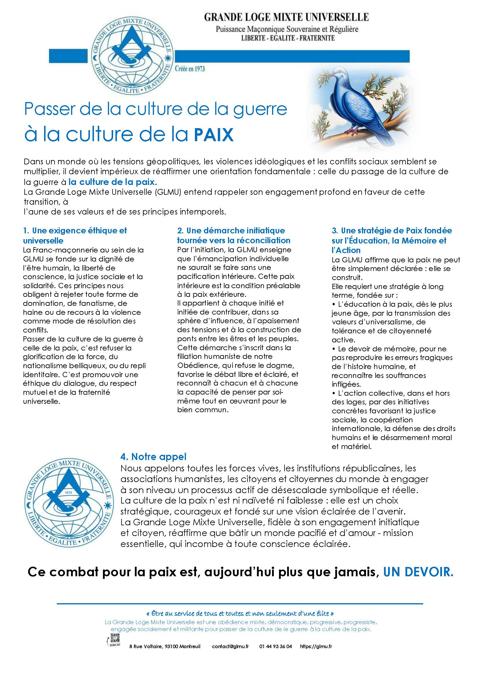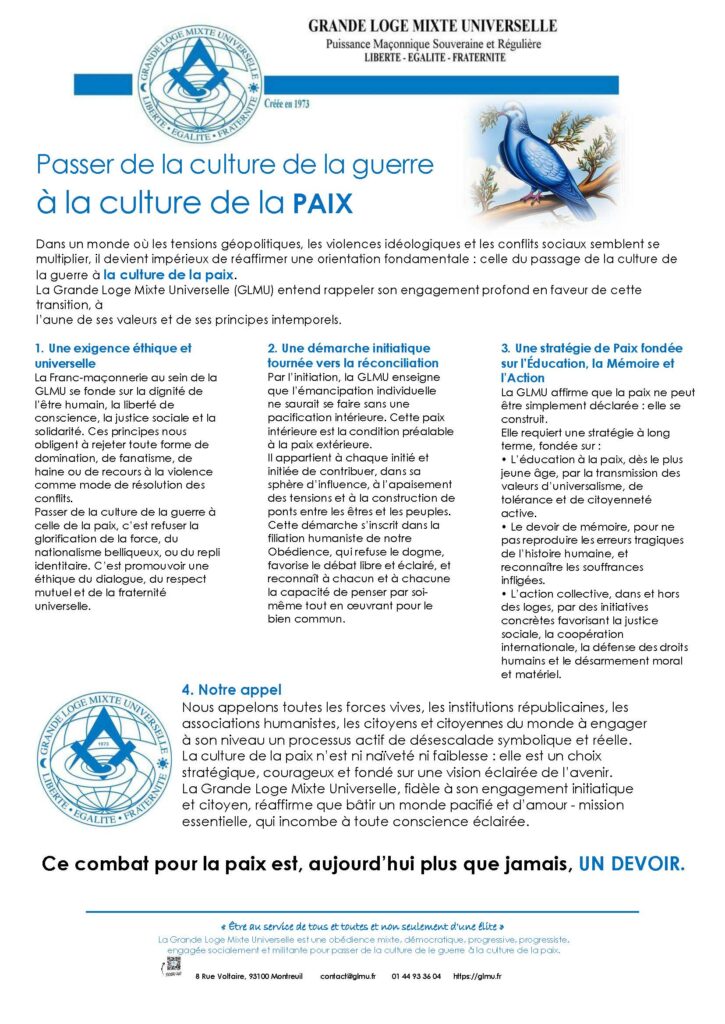 Communication de la Grande Loge Mixte Universelle (GLMU) pour la journée internationale du multilatéralisme et de la diplomatie au service de la paix sur la culture de la paix