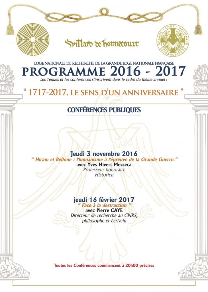 Voici le programme 2016 – 2017 de la Loge Nationale de Recherche Villard de Honnecourt, de la Grande Loge Nationale Française (GLNF) :