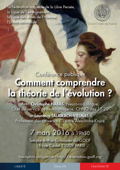 La Fédération Nationale de la Libre Pensée, la Ligue de l’Enseignement, la Ligue des Droits de l’Homme, L’Union Rationaliste et le Grand Orient de France organise une conférence publique à Paris le lundi 7 mars 2016 sur le thème « Comment comprendre la théorie de l’évolution  ? »