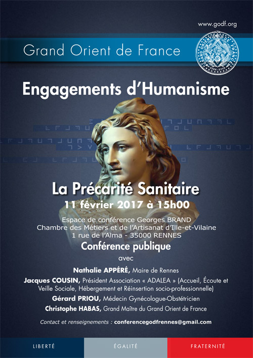Rennes – Samedi 11 février 2017 à 15 heures, Conférence publique du Grand Orient de France (GODF) dans le cadre des Engagements d’Humanisme sur le thème de La Précarité Sanitaire.
