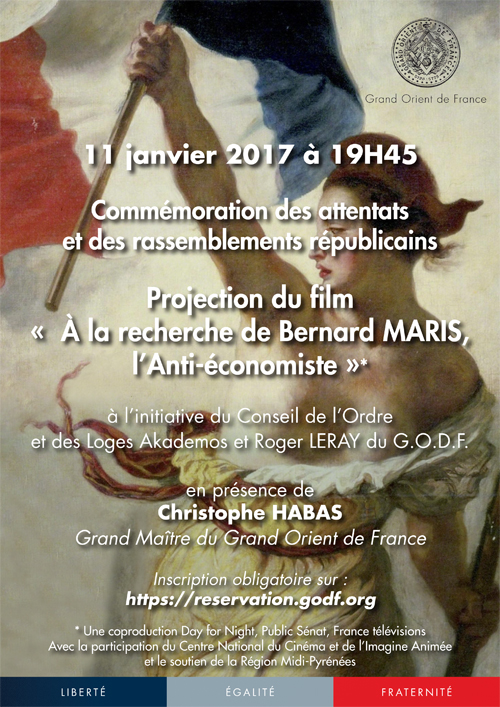 Paris, mercredi 11 janvier 2017 à 19h45, dans le cadre de la Commémoration des attentats et des rassemblements républicains, les Loges Akademos et Roger LERAY du G.O.D.F. vous invitent à la projection du film « À la recherche de Bernard MARIS, l’Anti-économiste »*