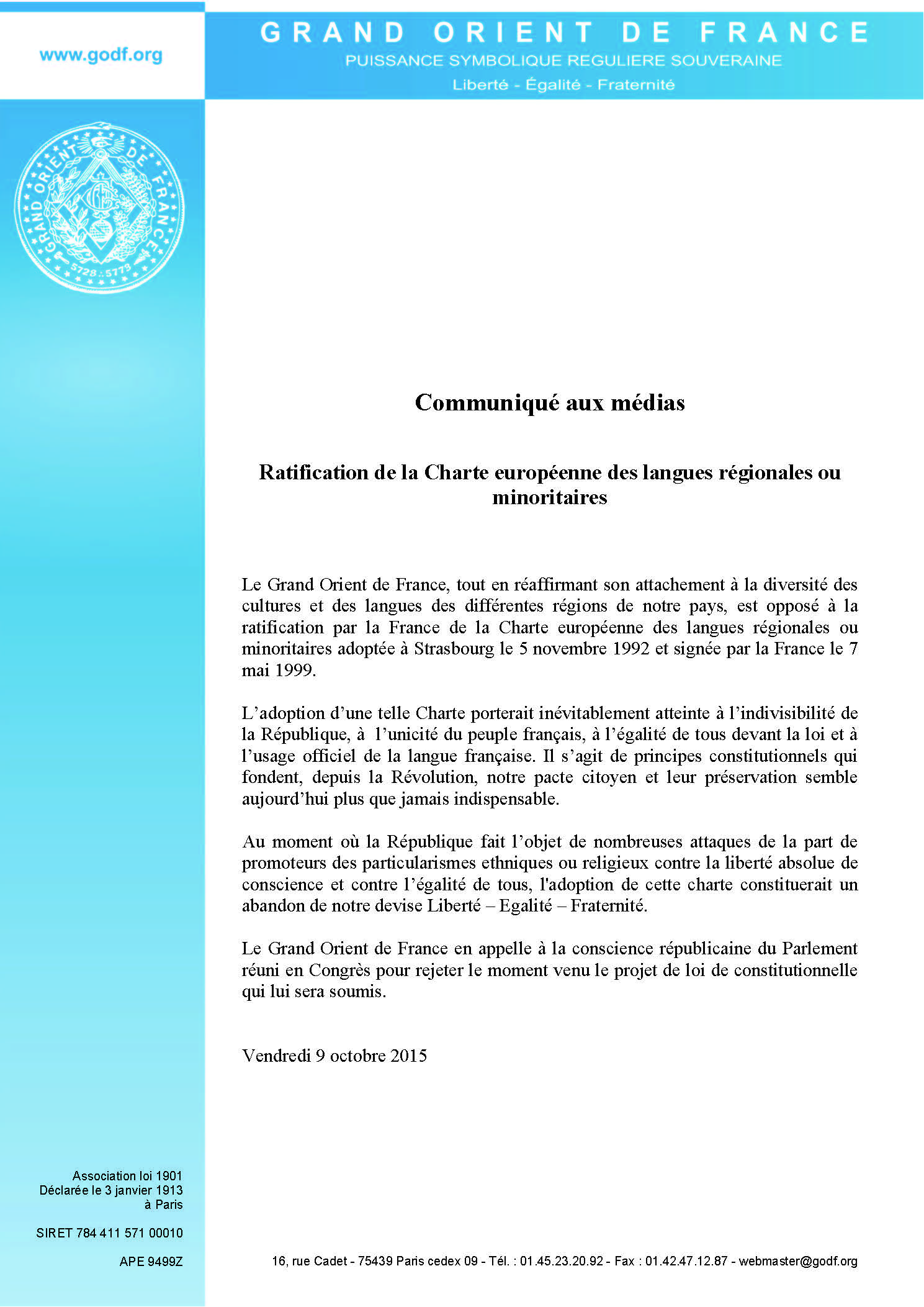 Communiqué du Conseil de l’Ordre du Grand Orient de France (GODF) du vendredi 9 octobre 2015 relatif à la Ratification de la Charte européenne des langues régionales ou minoritaires :