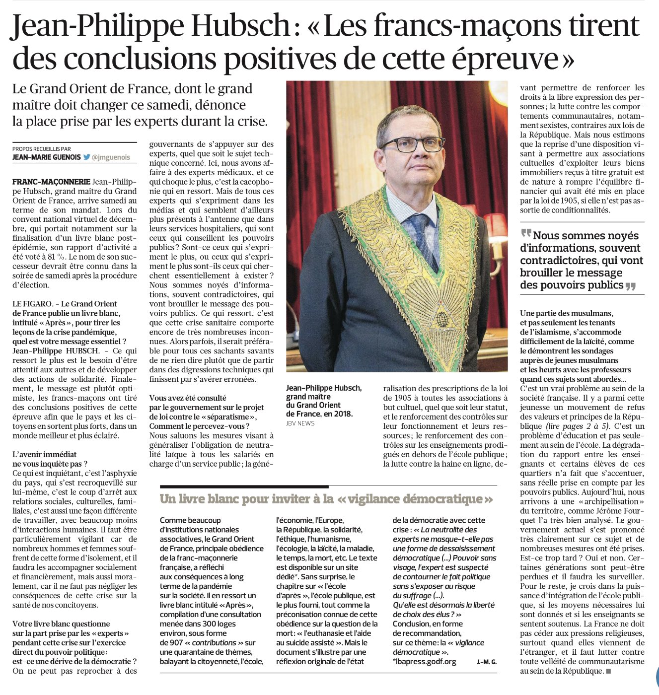 Sur le site « Le Figaro » du 15/01/2021, une interview du Grand Maître du Grand Orient de France (GODF) Jean-Philippe Hubsch :