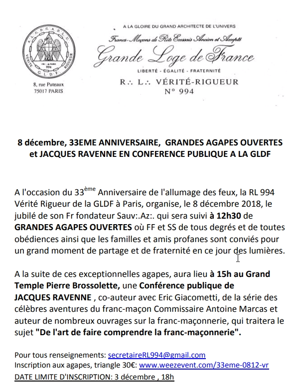 A l’occasion du 33ème Anniversaire de l’allumage des feux, la RL 994 Vérité Rigueur de la GLDF à Paris, organise, le 8 décembre 2018, le jubilé de son Fr fondateur Sauv:.Az:. qui sera suivi à 12h30 de GRANDES AGAPES OUVERTES où FF et SS de tous degrés et de toutes obédiences ainsi que les familles et amis profanes sont conviés pour un grand moment de partage et de fraternité en ce jour des lumières.