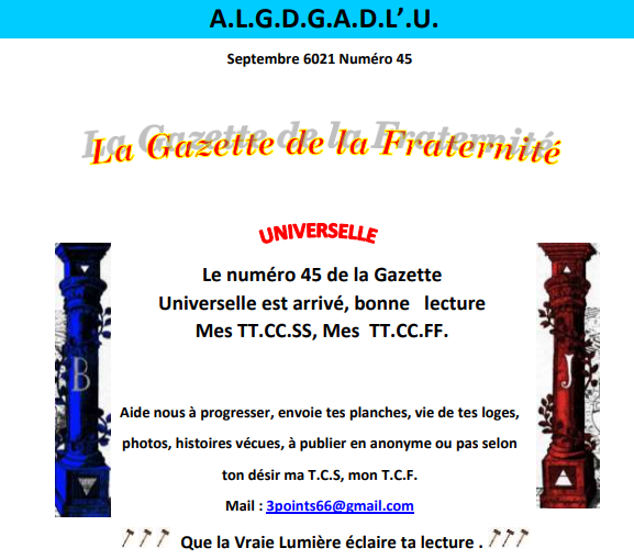 Voici le numéro 45 de la Gazette Universelle de la Fraternité