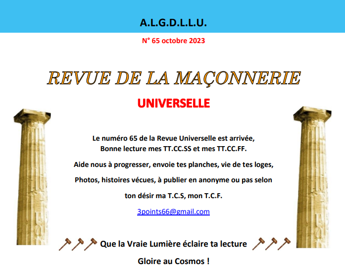 Voici le numéro 65 de la Revue Maçonnique universelle de la Fraternité