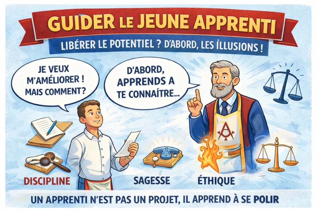Le paradoxe est beau : on guide l’Apprenti pour qu’il devienne autonome. On l’éclaire pour qu’il apprenne à marcher sans nous. On l’aide à se construire… sans construire à sa place. Et si l’on devait résumer avec un brin d’ironie : en loge, on ne “libère pas un potentiel illimité”, on commence par libérer le jeune Apprenti de ses illusions. C’est moins vendeur. Mais nettement plus initiatique.