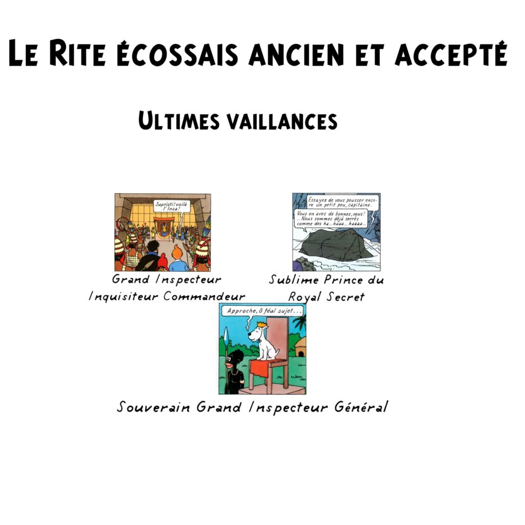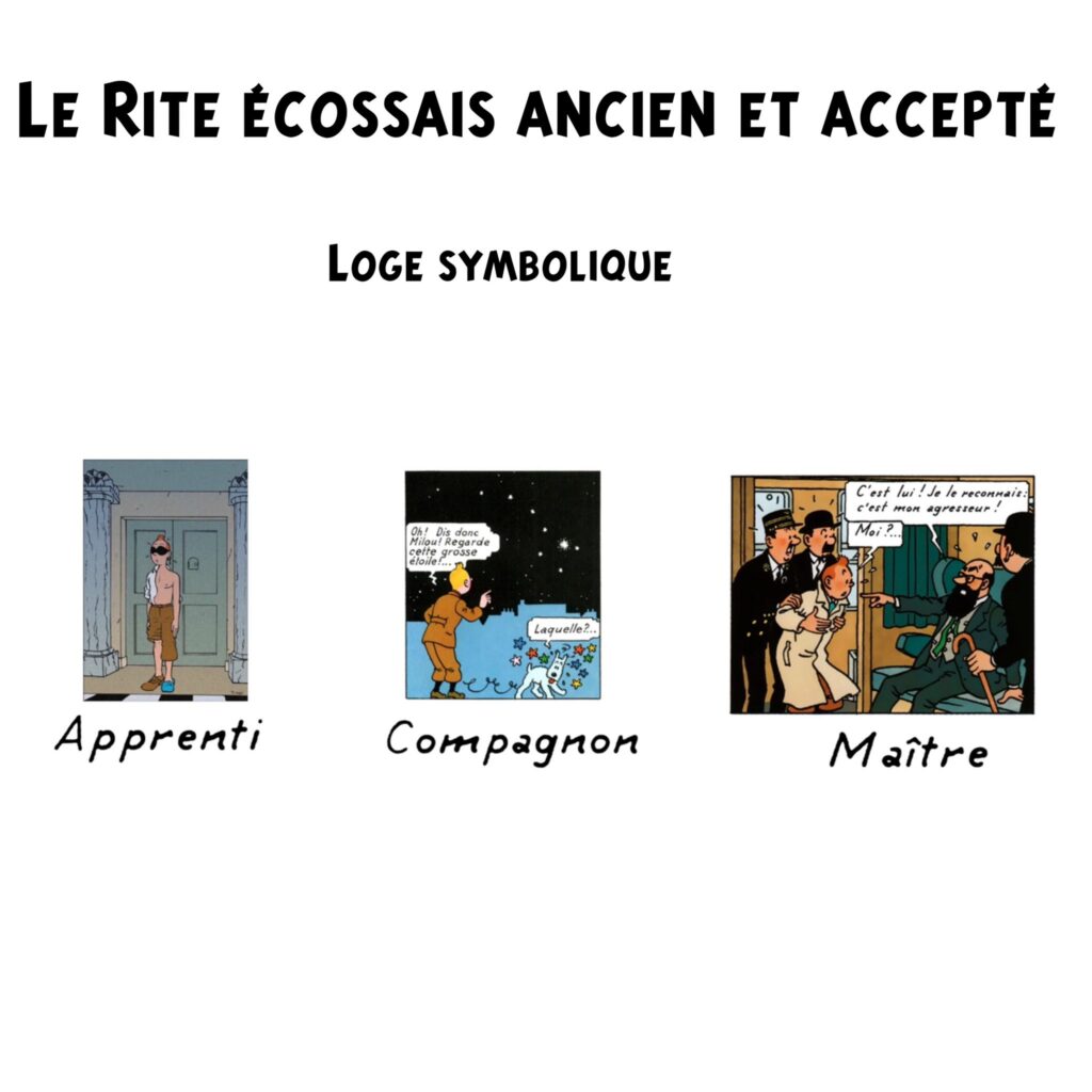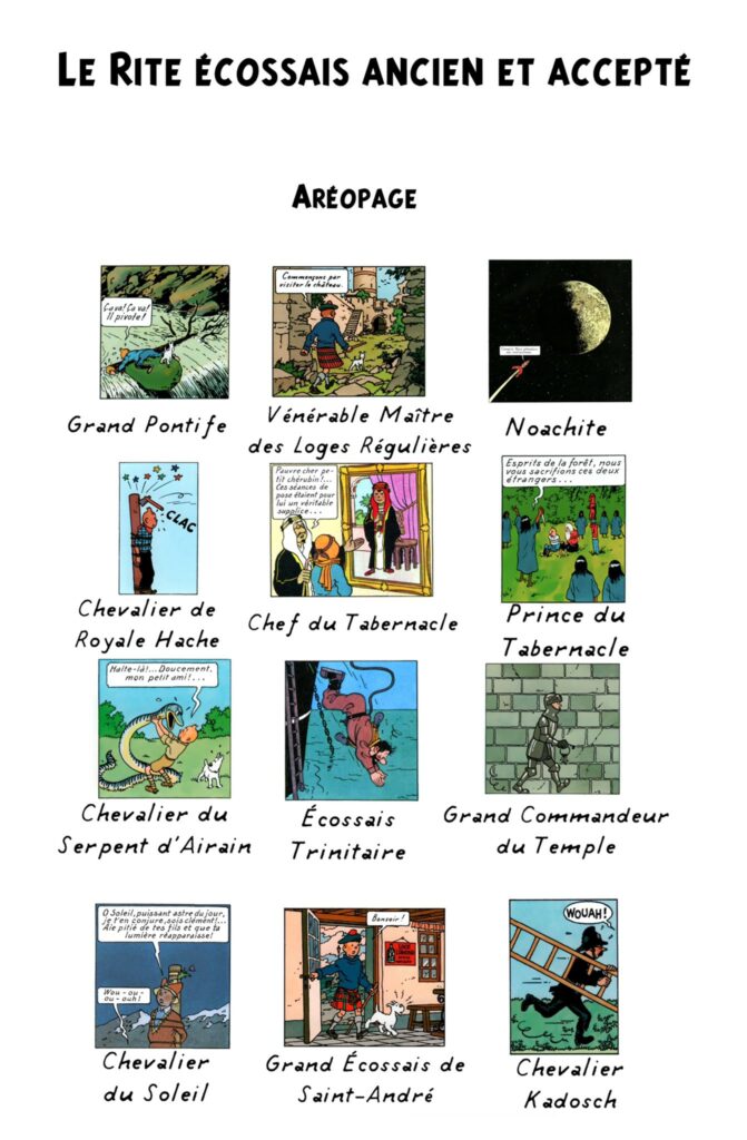 Le compte Twitter Entre Les Colonnes (@mesureur357) a publié « Thread (ou fil rempli) de spoilers sur le REAA et ses différents degrés sous forme de double hommage à la fois au rite et à Tintin«