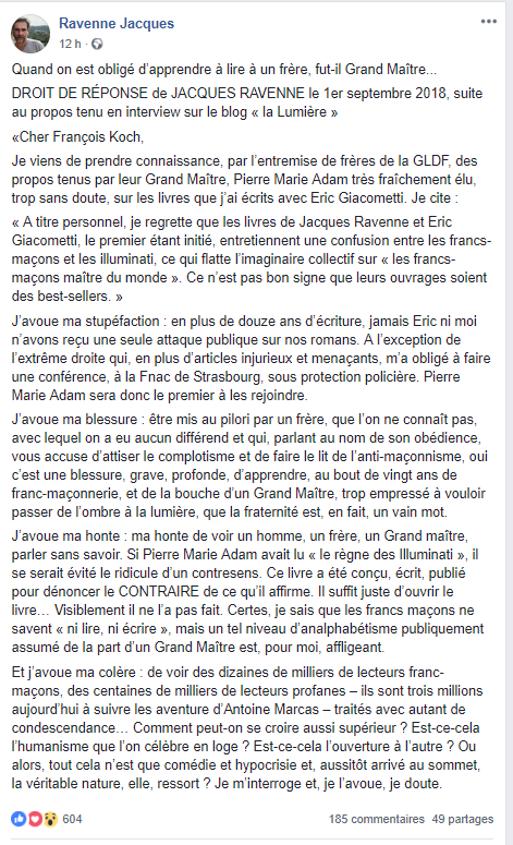 Visiblement irrité, l’écrivain Jacques Ravenne a tenu à répondre au Grand Maître de la GLDF :