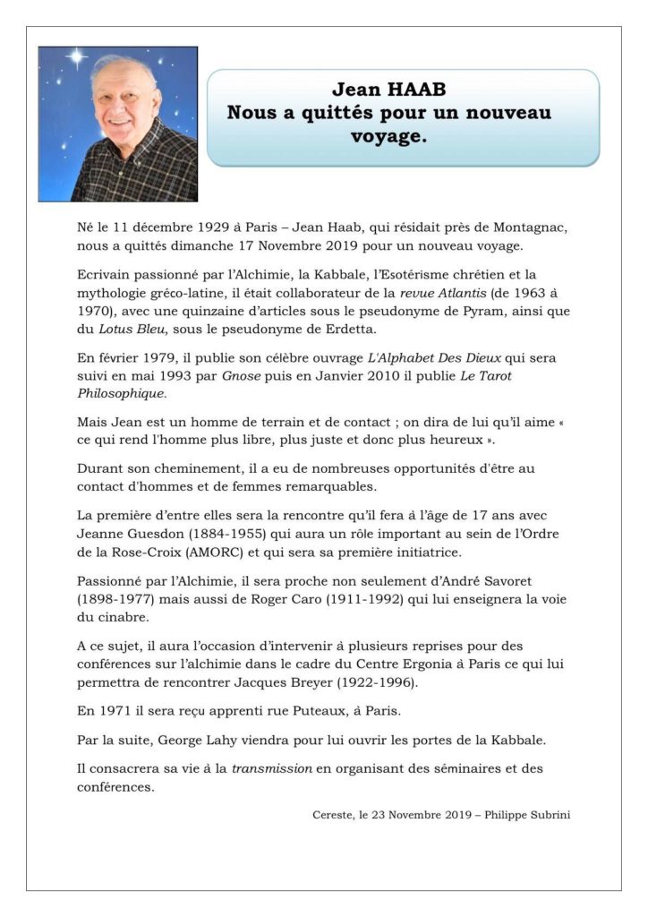 JEAN HAAB, NOUS A QUITTE POUR UN NOUVEAU VOYAGE Actualités | 25 novembre 2019 | 1 | by A.S. Gémissons, Gémissons, Gémissons…