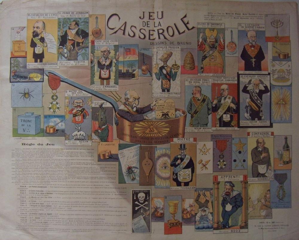 Le « jeu de la casserole » est un jeu de l’oie antimaçonnique en trente-trois cases, illustré de caricatures, qui fut mis en vente dès 1905.