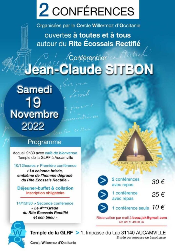 Les conférences données par Jean-Claude Sitbon le seront sur les sujets suivants : à 10h00 « La colonne brisée, emblème de l’homme dégradé du Rite Ecossais Rectifié » puis à 14h00 « Le 4ème grade du Rite Ecossais Rectifié et son bijou ».