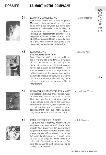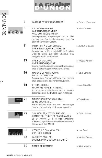 La Revue Trimestrielle « La Chaîne d’Union » N° 76 d’avril 2016, revue d’étude maçonniques, philosophiques et symbolique publiée par le Grand Orient de France consacre un dossier « La mort, votre compagne » qui se compose d’articles de Jacques TRESCASES, Dominique AUBRY, Jean-Pierre VILLAIN, Xavier-Laurent SALVADOR.