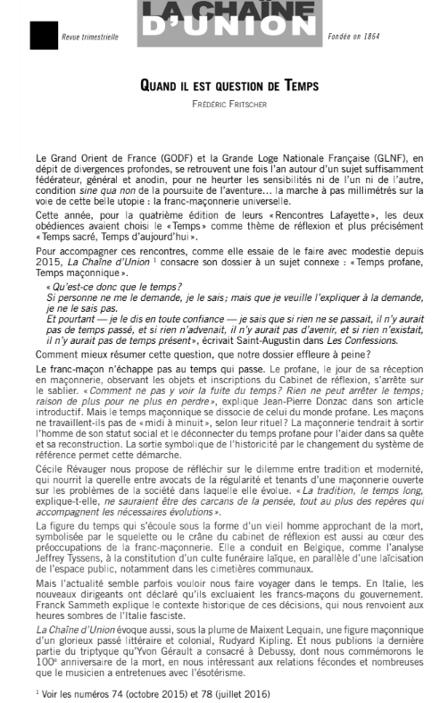 La Revue Trimestrielle « La Chaîne d’Union« , revue d’étude maçonniques, philosophiques et symbolique publiée par le Grand Orient de France de juillet 2018 (N°85) a pour dossier central « Temps profane, temps maçonnique »
