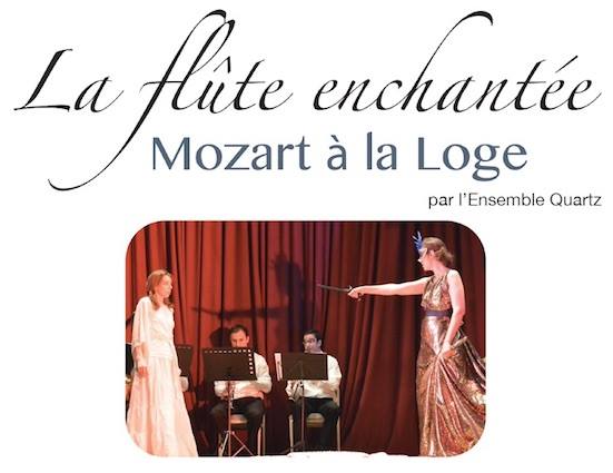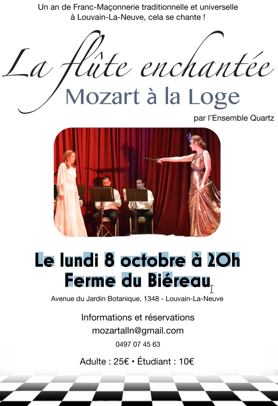 Elle organise avec l’Ensemble Quartz (http://www.ensemblequartz.be/portal/) et les chanteurs Sabine Conzen (http://www.sabineconzen.com/) dans le rôle de Pamina,Aurélie Moreels (http://www.aureliemoreels.be/) dans les rôles de la Reine de la Nuit et de Papagenna, Kobe Bayens dans le rôle de Papageno et Vincent Lesage dans le rôle de Tamino une représentation des meilleurs morceaux de la Flûte Enchantée de Mozart. Cette représentation a déjà connu un immense succès, notamment il y a trois ans dans le grand temple de la rue Royale.