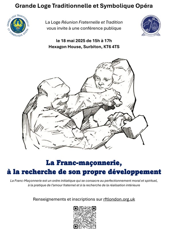 La Loge Réunion Fraternelle et Tradition n° 459 de la Grande Loge Traditionnelle et Symbolique Opéra vous convie vous inscrire pour participer à cette conférence publique le dimanche 18 mai 2025 à 15h à Surbiton.
