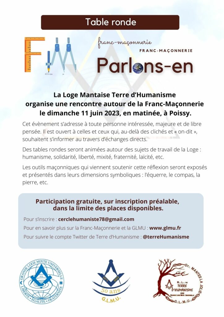 Nous avons le plaisir de vous informer d’un évènement ouvert à tous publics « La Franc-maçonnerie, parlons-en- La GLMU » organisé à l’initiative de la loge Terre d’Humanisme qui déroulera le dimanche 10 juin 2023 à Poissy en présence de Bernard DEKOKER-SUAREZ, Grand Maître de la Grande Loge Mixte Universelle (GLMU)