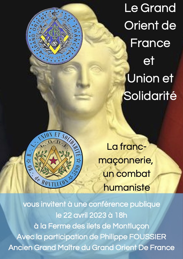 La loge « Union et Solidarité » de Montluçon organise une conférence publique le samedi 22 avril 2023 avec la participation de Philippe Foussier, ancien Grand Maître du GODF.