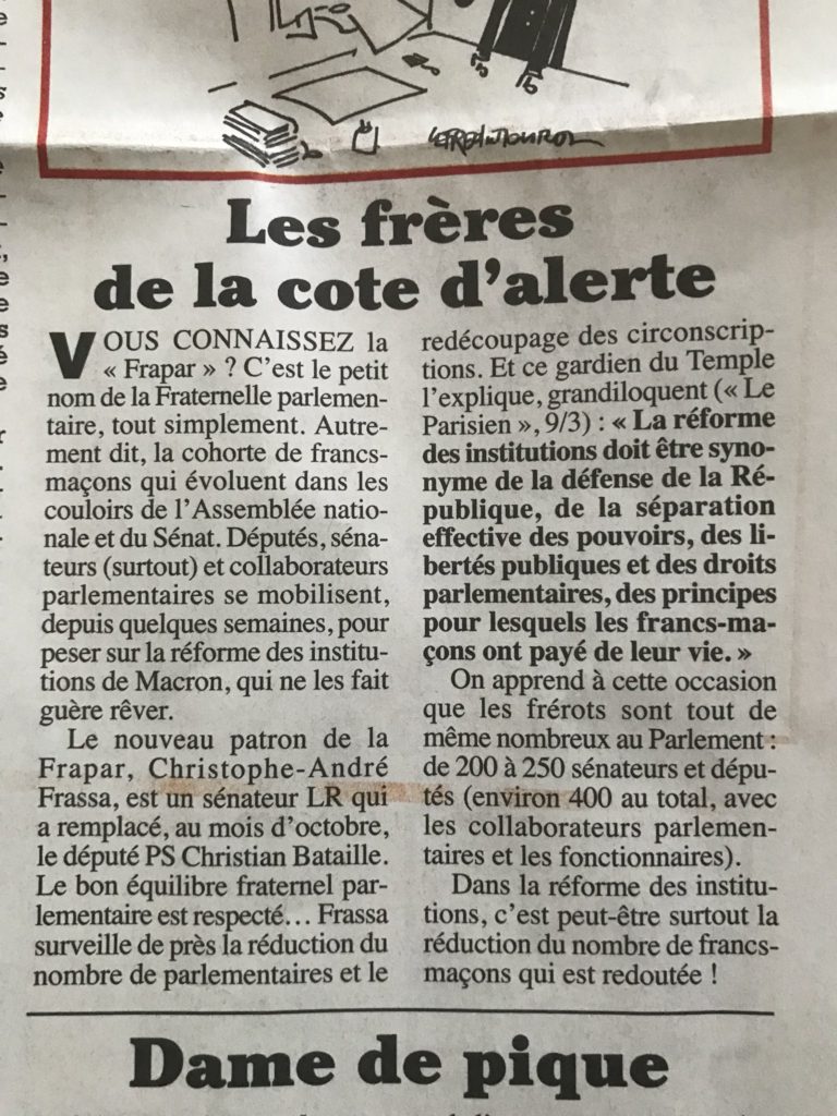 Voici un article paru dans Le Canard Enchaîné du mercredi 14 mars 2018 intitulé « Les Frères de la cote d’alerte » relatif à la Fraternelle Parlementaire, la FRAPAR.