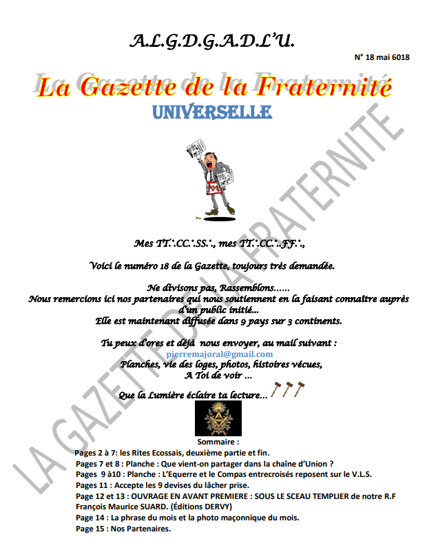 Je vous avais déjà parlé de la « Gazette Catalane de la Fraternité« , une revue mensuelle qui propose des planches maçonniques, des annonces d’évènements, des réflexions, etc…