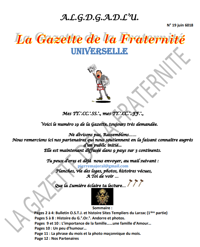 Je vous avais déjà parlé de la « Gazette Catalane de la Fraternité« , une revue mensuelle qui propose des planches maçonniques, des annonces d’évènements, des réflexions, etc…
