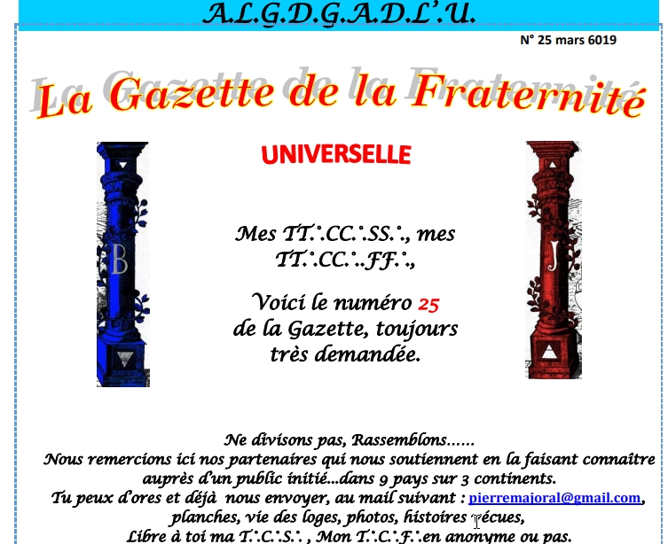 Voici le numéro 25 de MARS 2019 de Gazette Universelle de la Fraternité https://www.gadlu.info/wp-content/uploads/2019/04/NUMERO-25.pdf