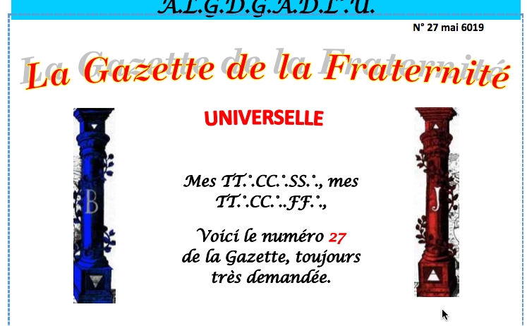 Voici le numéro 27 de MAI 2019 de Gazette Universelle de la Fraternité