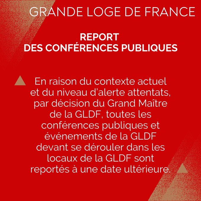 « Les événements publics prévus dans les locaux de la Grande Loge De France (GLDF) sont malheureusement reportés en raison du niveau maximum d’alerte attentat. La sécurité de tous reste notre priorité absolue Nous vous tiendrons informé des nouvelles dates dès que possible. Restez vigilants et solidaires. »