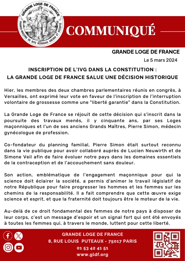 La Grande Loge de France se réjouit de cette décision qui s’inscrit dans la poursuite des travaux menés, il y cinquante ans, par ses Loges maçonniques et l’un de ses anciens Grands Maîtres, Pierre Simon, médecin gynécologue de profession.