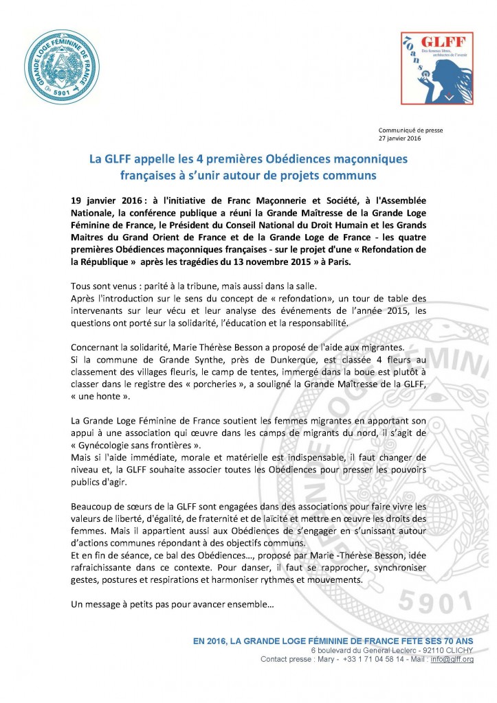 19 janvier 2016 : à l’initiative de Franc Maçonnerie et Société, à l’Assemblée Nationale, la conférence publique a réuni la Grande Maîtresse de la Grande Loge Féminine de France, le Président du Conseil National du Droit Humain et les Grands Maitres du Grand Orient de France et de la Grande Loge de France – les quatre premières Obédiences maçonniques françaises – sur le projet d’une « Refondation de la République » après les tragédies du 13 novembre 2015 » à Paris.