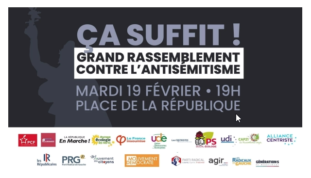 Aussi, nous appelons les membres de l’Obédience à se joindre à la manifestation républicaine organisée mardi 19 février à 19h, place de la République à Paris pour dénoncer l’antisémitisme et rappeler que « Non, l’antisémitisme, ce n’est pas la France ».