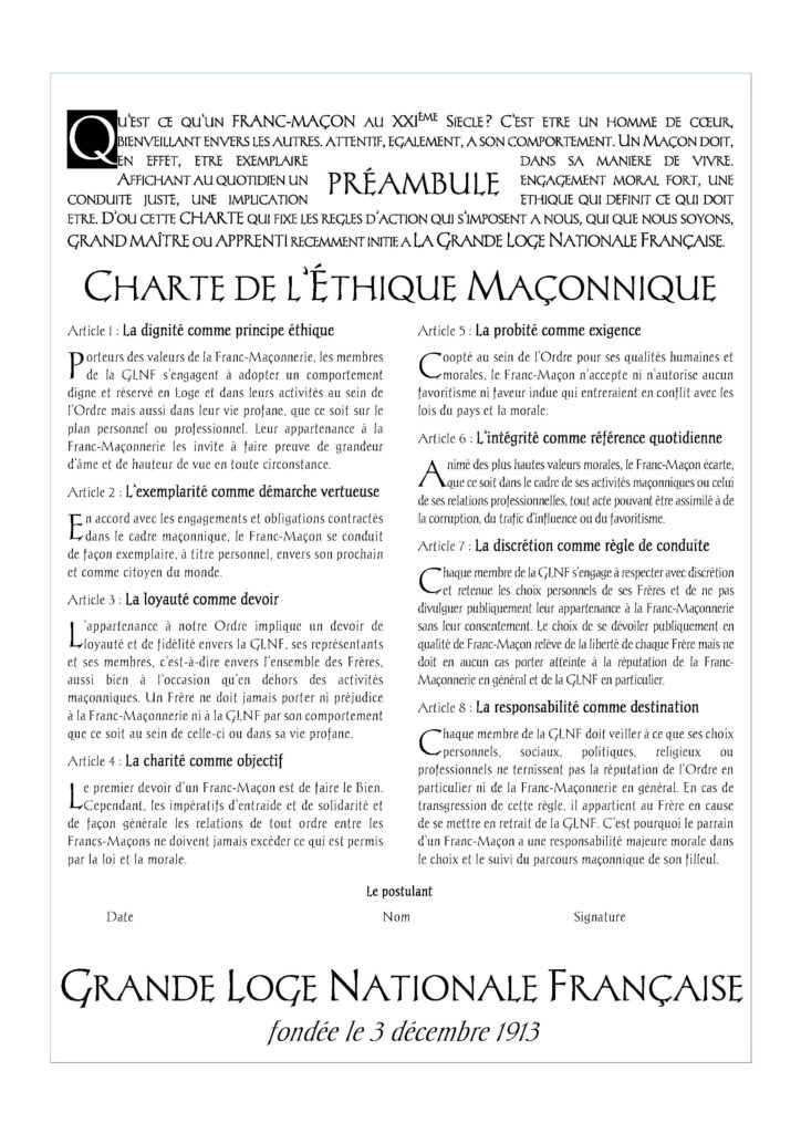 CHARTE DE L’ETHIQUE MACONNIQUE DE LA GRANDE LOGE NATIONALE FRANCAISE