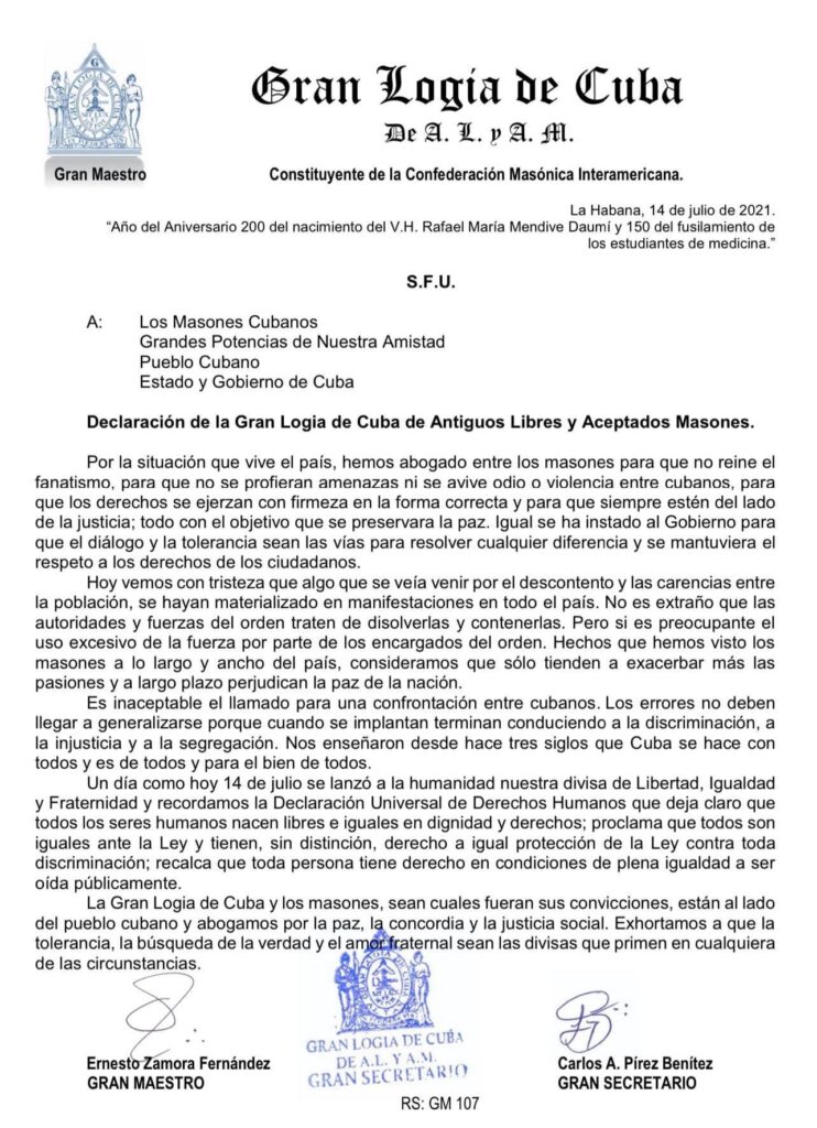 En raison de la situation dans le pays, nous préconisons parmi les maçons que le fanatisme ne prévale pas, que ni l’inimitié, ni la haine ni la violence ne prévalent parmi les Cubains, que les droits soient toujours défendus et de manière correcte et qu’ils soient toujours du côté de la justice. ; le tout dans le mais de préserver la paix. De même, nous avons exhorté le Gouvernement à ce que le dialogue et la tolérance soient les moyens de résoudre tout différend et de respecter les droits des citoyens.