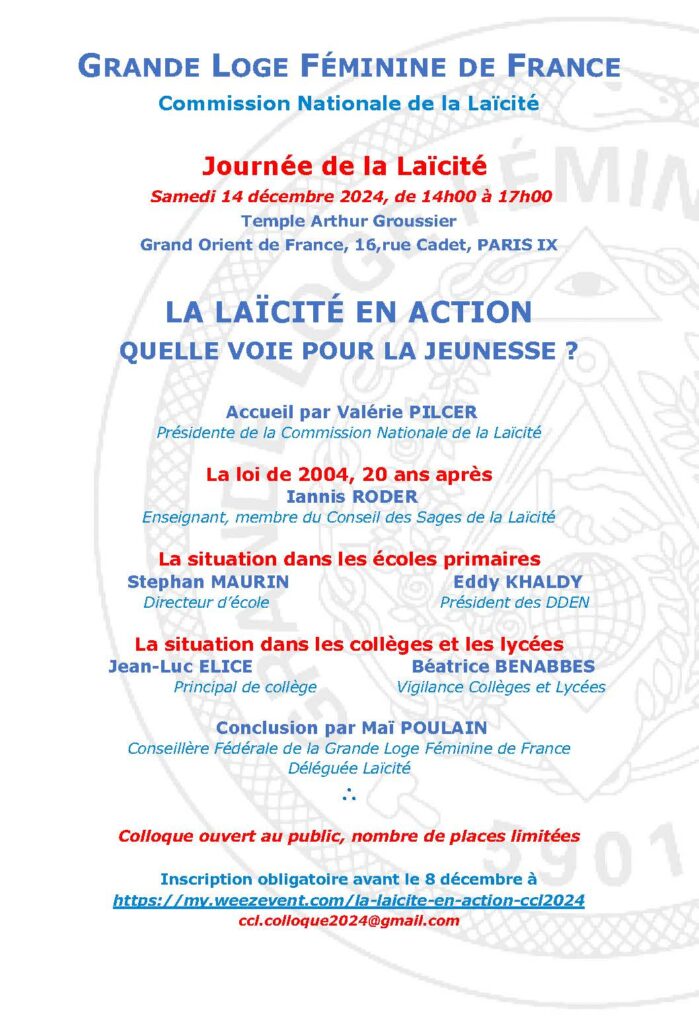 La Grande Loge Féminine de France et La Commission Nationale de la Laïcité vous invitent à sa Journée de la Laïcité sur le thème « La laïcité en action, quelle voie pour la jeunesse ? »