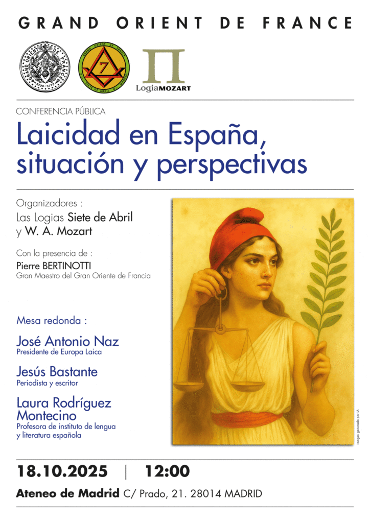 Les Loges Siete de Abril et W. A. Mozart ont organisé une conférence publique exceptionnelle intitulée : « Laicidad en España, situación y perspectivas » – « Laïcité en Espagne, situation et perspectives »,