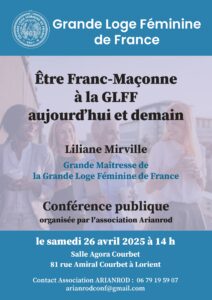 Grande Maîtresse de la Grande Loge Féminine de France, Liliane Mirville sera à Lorient (Morbihan) ; samedi 26 avril 2025, pour participer à une conférence publique organisée par l’association Arianrod.