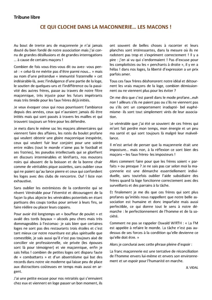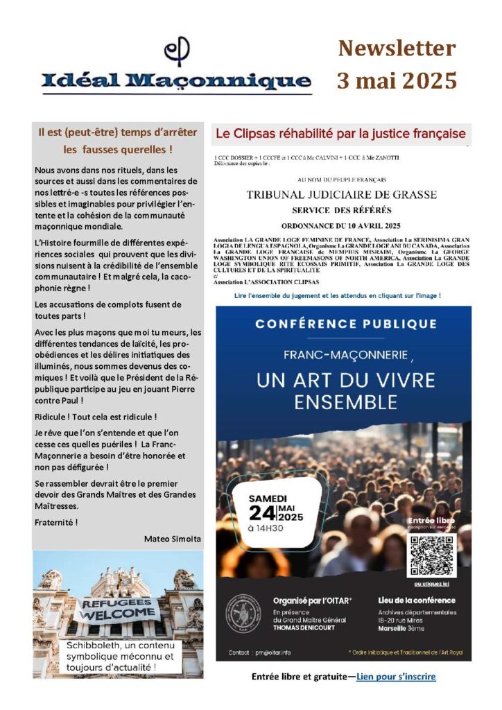 Voici la newsletter (ou lettre d’information) de mai 2025 du site Idéal maçonnique avec notamment une tribune libre intitulée : CE QUI CLOCHE DANS LA MACONNERIE… LES MACONS !