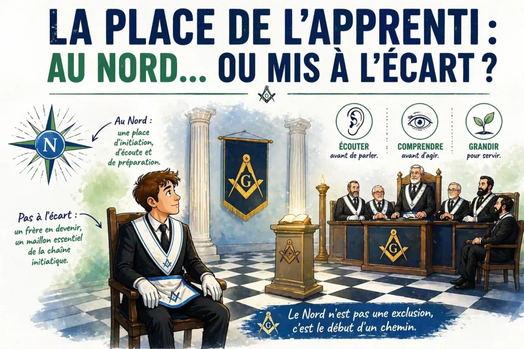 On affirme que l’Apprenti est placé au Nord pour être protégé de la Lumière. L’explication est belle, symbolique, rassurante. Pourtant, une question dérange : l’Apprenti est-il réellement protégé… ou parfois simplement tenu à distance ? Car dans certaines loges contemporaines, la pédagogie initiatique se transforme insensiblement en mise à l’écart confortable. On explique au nouvel initié qu’il doit observer, écouter, intégrer. Mais on oublie parfois de lui transmettre ce qui donne sens à cette attente. Le Nord devrait être un espace de maturation, pas une antichambre silencieuse où l’enthousiasme s’éteint lentement.