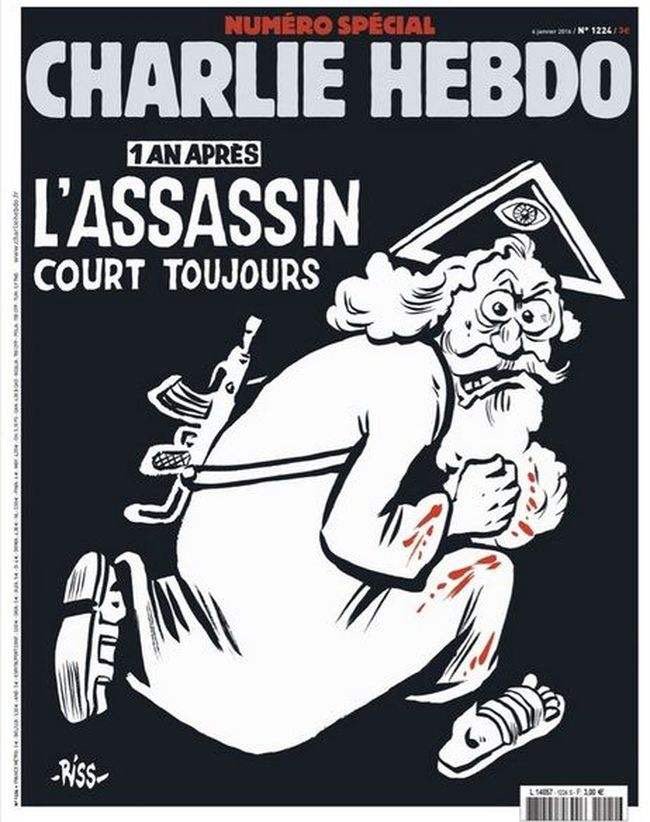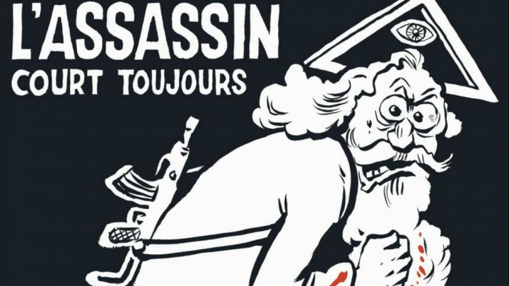 Un dieu barbu avec une Kalashnikov sur le dos, à l’habit ensanglanté sous le titre: « 1 an après, l’assassin court toujours », et avec au dessus de sa tête un triangle frappé d’un œil, symbole de la Trinité ou de la franc-maçonnerie selon les choix de chacun !
