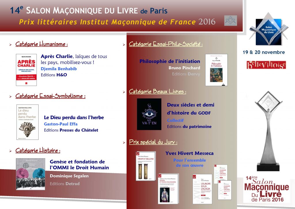 Cinq Prix littéraires de l’Institut Maçonnique de France, dont le célèbre « Prix Humanisme », ont été remis le dimanche 20 novembre 2016 en présence de nombreuses personnalités.