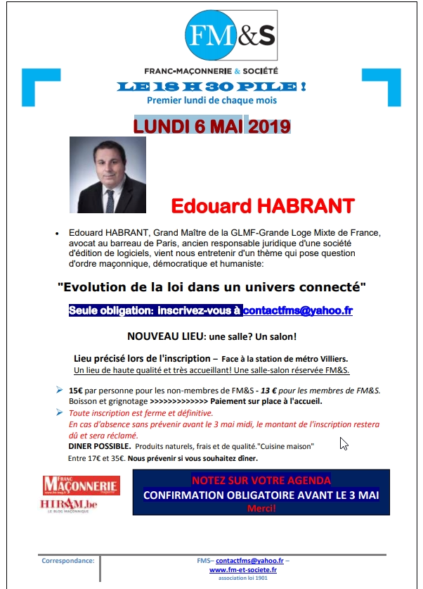Le dernier 18H30 PILE! de l’année,le lundi 6 mai, accueillera le Grand Maître de la Grande Loge Mixte de France-GLMF, Edouard Habrant, avocat au Barreau de Paris, sur un sujet qui ne peut vous laisser indifférent: Evolution de la loi dans un univers connecté.