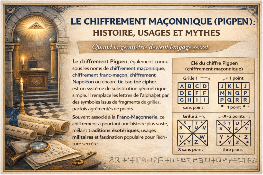 Souvent associé à la Franc-Maçonnerie, ce chiffrement a pourtant une histoire plus vaste, mêlant traditions ésotériques, usages militaires et fascination populaire pour l’écriture secrète.