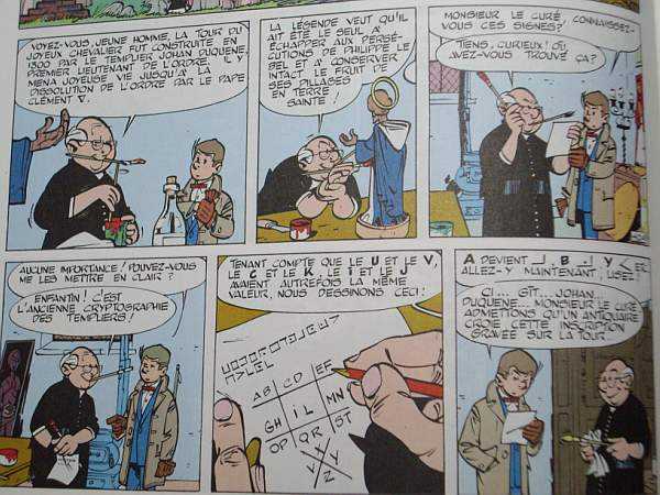 Dans « La voiture immergée », de Maurice Tillieux, BD parue aux éditions Dupuis en 1958, un prêtre révèle au héros de l’histoire que le parchemin en leur possession est crypté selon l’écriture secrète des Templiers et il présente un papier donnant le code de l’écriture maçonnique. J’avoue ne pas savoir si Tillieux, mort dans un accident de voiture, était maçon.