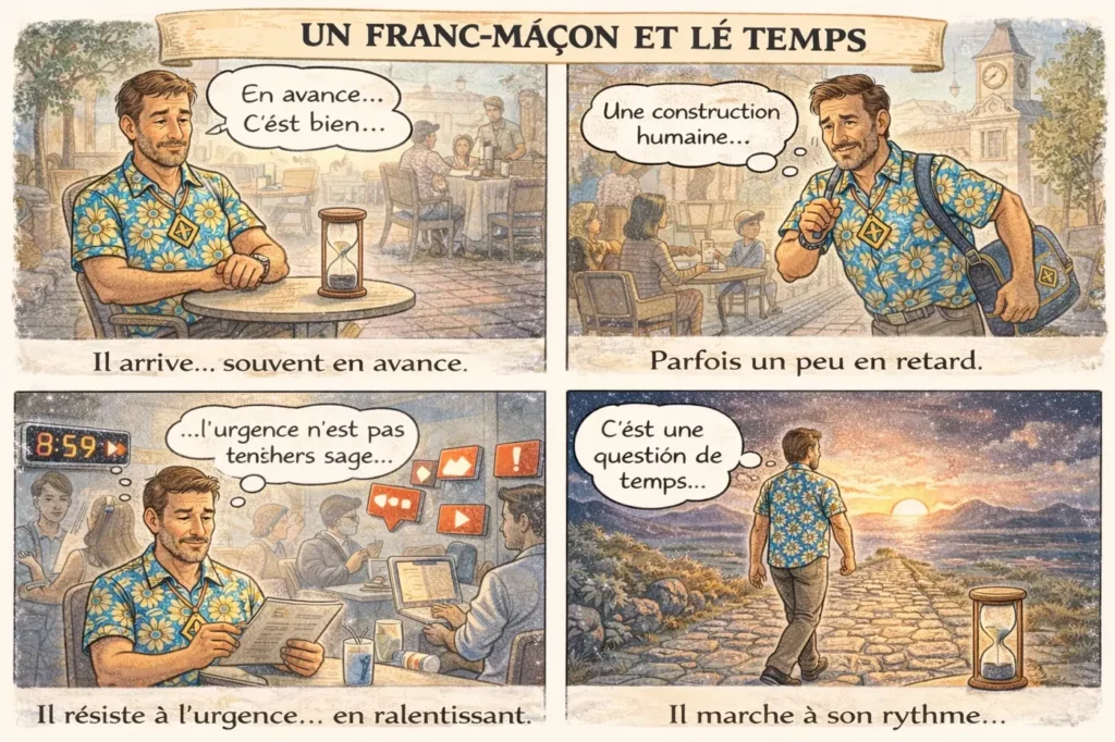 Conclusion : le franc-maçon ne cherche pas à maîtriser le temps. Il apprend à s’y inscrire. À respecter son rythme. À comprendre que la vraie initiation ne se mesure pas en heures, mais en transformations silencieuses.