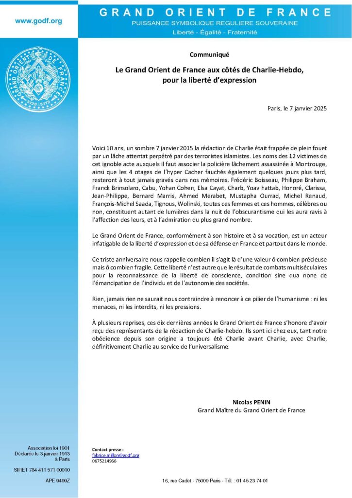 À plusieurs reprises, ces dix dernières années le Grand Orient de France s’honore d’avoir reçu des représentants de la rédaction de Charlie-hebdo. Ils sont ici chez eux, tant notre obédience depuis son origine a toujours été Charlie avant Charlie, avec Charlie, définitivement Charlie au service de l’universalisme.