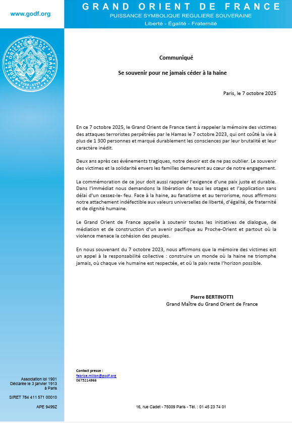 En ce jour de mémoire, le Grand Orient de France (GODF) s’incline avec recueillement devant les victimes des attaques du 7 octobre 2023, rappelant que le devoir de souvenir s’accompagne d’une exigence universelle de paix et de dignité humaine.